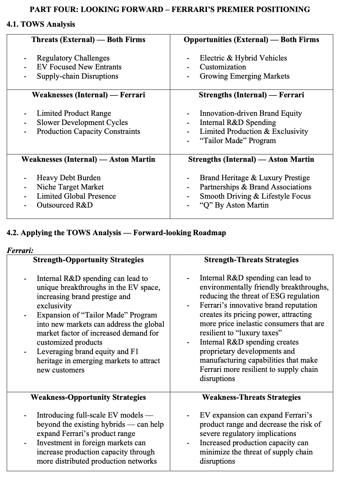 In addition to its demonstrated success in strategic positioning and creating a competitive advantage, Ferrari’s value chain and operational strengths make it better prepared to navigate the changing industry landscape over the foreseeable future. Ferrari is better positioned to take advantage of opportunities, mitigate threats, and improve its weaknesses. Specifically, Ferrari’s key strengths make the firm uniquely able to capture market opportunities in electrification and untapped TAMs in emerging markets. These same strengths effectively mitigate the emerging threats of regulation, new EV-focused entrants, and supply-chain risks by allowing Ferrari to proprietarily develop regulation- friendly EV technologies that combat new entrants. Furthermore, Ferrari’s weaknesses are largely non-issues as they limit total production capabilities but reinforce scarcity and exclusivity. In comparison, Aston Martin is unprepared to navigate the fluid dynamics of the industry. Because of financial constraints and the negative impact of partnerships on margins, Aston Martin will not be able to effectively harness its strengths to address market opportunities or threats. Aston Martin’s strengths lack the true ability to address market opportunities or threats without additional liquidity injections. Without a unique ability to innovate and the capital required to expand into untapped TAMs, Aston Martin will continue to lose market share to more innovative participants. In addition, despite raising £1.9 billion of additional capital since its IPO, the firm continues to see production delays, market share loss, and increased reliance on partnerships. Overall, Ferrari’s robust strategic positioning, distinct competitive advantage, and strong financial performance indicate that the firm is well-equipped to successfully navigate the challenges of the car manufacturing industry. Aston Martin’s lack of clear strategic focus, heavy debt burden, and high propensity of production delays have led to poor financial performance and a weak strategic outlook.
