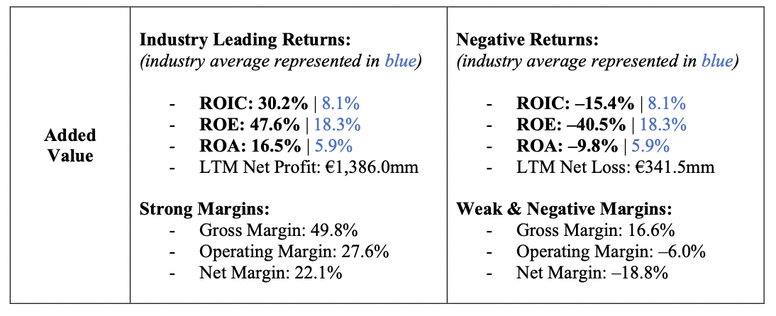 Due to its advanced strategic positioning and clear competitive advantage, Ferrari’sLTM (as of June 2024) ROA (16.5%), ROE (47.6%), and ROIC (30.2%) have significantly outperformed the industry averages of 5.9%, 18.3%, and 8.1%, respectively. This recent profitability underscores Ferrari’s ability to sustain its core competitive advantage. In its annual Capital Markets Day, Ferrari reaffirmed its commitment to keeping drivetrain and electrification capital spending in-house, continuing its key driver of success. In addition to profitability metrics, Ferrari outperformed Aston Martin in Gross Margin (49.8% vs. 16.6%), Operating Margin (27.6% vs. –6.0%), and Net Margin (22.1% vs. –18.8%). In contrast, Aston Martin’s financial performance is characterized by negative profitability and poor margins. Aston Martin’s ROA (–9.8%), ROE (–40.5%), and ROIC (–15.4%) fall well below Aston Martin has struggled to establish a clear strategic direction. Despite its heritage and distinctive British appeal, Analysts question the viability of Aston Martin continuing as a stand-alone entity due to high sensitivity to delays and adverse market conditions. Recent supply disruptions and demand shortfalls in China forced management to further downgrade 2024 financial projections — expecting about 1,000 fewer vehicles to be delivered than originally expected (Reuters, 2024). These sales projection downgrades supply disruptions and demand shortfalls not only eat into revenue expectations, but they add variable costs on core vehicle production, further eroding margin and the firm’s “wedge.”