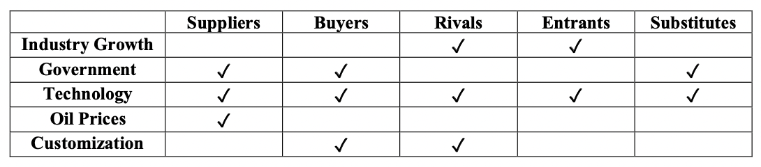 Government Regulations: Electric vehicle subsidies, the creation of “luxury car taxes,” and emission standards, are becoming more common in the car manufacturing industry. Recent regulations include the EU’s Euro 6 and Euro 7 emissions standards, the USA’s Corporate Average Fuel Economy Standards, and China’s New-Energy Vehicle Mandate. Each of these regulations imposes headwinds on the industry and impacts certain forces. Specifically, suppliers have more power as manufacturers begin to heavily depend on emission reducing inputs. Furthermore, regulations increase the bargaining power of buyers as they are more likely to purchase eco-friendly models that come with less of a tax burden. Finally, government regulations increase the threat of substitutes to traditional luxury cars by incentivizing electric alternatives.