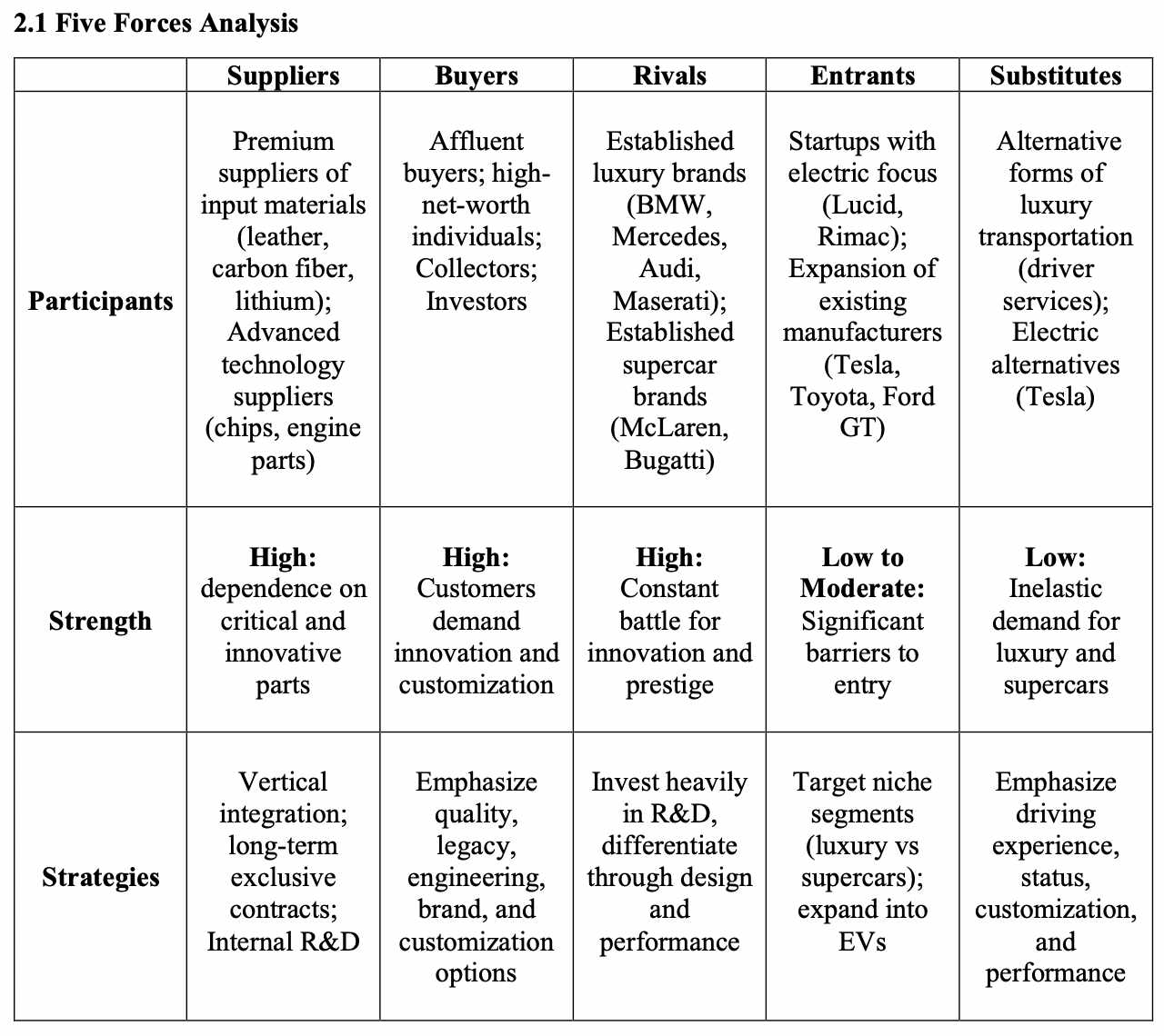 Industry Growth: The overall car manufacturing industry is valued at $2.8 trillion in 2024 with the expectation to grow to $6.5 trillion by 2032, implying a CAGR of 8.7%. More specifically, the luxury car segment of the broader car manufacturing industry was valued at $1.2 trillion in 2023, expected to grow to $2.8 trillion by 2032, implying a CAGR of 10.1%. The key factors to growth in the segment are electrification and customization. Affluent customers value the cutting-edge innovation of luxury vehicles and react positively to “exclusive” features and customization options. Furthermore, the supercar segment of the industry was valued at $17.0 billion in 2022 with the expectation to grow to $22.6 billion by 2031, implying a CAGR of 3.7% (Global Newswire, 2023). Industry growth impacts rivalry amongst competitors and the threat of new entrants. First, industry growth amplifies competitive rivalry because market participants fight to expand their market share to capture a disproportionate amount of growth. Increased rivalry would create races for innovation, luxury features, customization, and performance. Second, industry growth impacts the threat of new entrants by attracting new players looking to capture a portion of the overall market growth. However, the luxury and supercar segments have strong barriers to entry due to legacy brand names, but they are not fully insulated from new entrants, as evidenced by Rimac’s recent entrance into the electric supercar market. Despite this industry growth, each competitor’s unique strategy determines how much of the overall growth they can capture. The company with the best positioning and strategy will capture more growth while expanding its market share.
