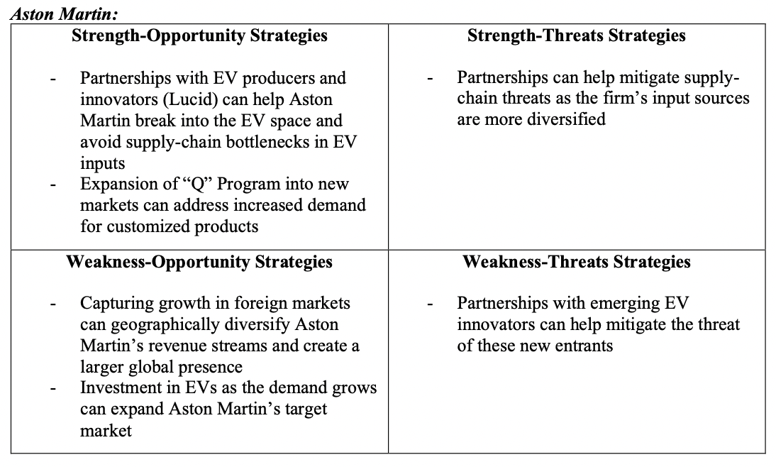 Aston Martin’s strategic positioning involves blending distinctively British luxury craftsmanship, partnership-driven performance capabilities, and lifestyle-oriented appeal. Aston Martin appeals to buyers who value luxury designs, heritage, and elegance over performance and technical sophistication. While Aston Martin develops technologically advanced supercars and track- worthy vehicles, the brand focuses on grand touring and lifestyle appeal. Aston Martin’s strategic positioning is very niche and less clear than other competitors. Ferrari positions itself as the pinnacle of performance, and Bentley positions itself as the pinnacle of luxury and comfort. Aston Martin falls between these participants as a “luxury-oriented” brand that still creates supercars and performance vehicles. Thus, Aston Martin has a comparatively weak strategic positioning.