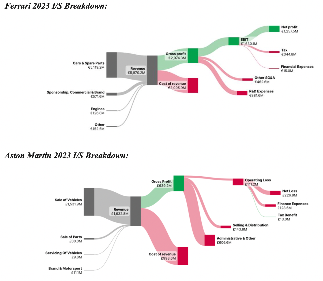 Ferrari is able to charge premium prices by increasing willingness to pay through its product superiority and innovative focus. This is evidenced by its higher gross margin (49.8%) and a lower COGS as a percentage of revenue (50.2%) compared to Aston Martin. In addition, Ferrari boasts a slightly lower SG&A expense as a percentage of revenue. While they are similar, R&D expenses accounted for the majority of Ferrari’s SG&A balance — implying significant reinvestment and strategic alignment with its positioning as a differentiator.